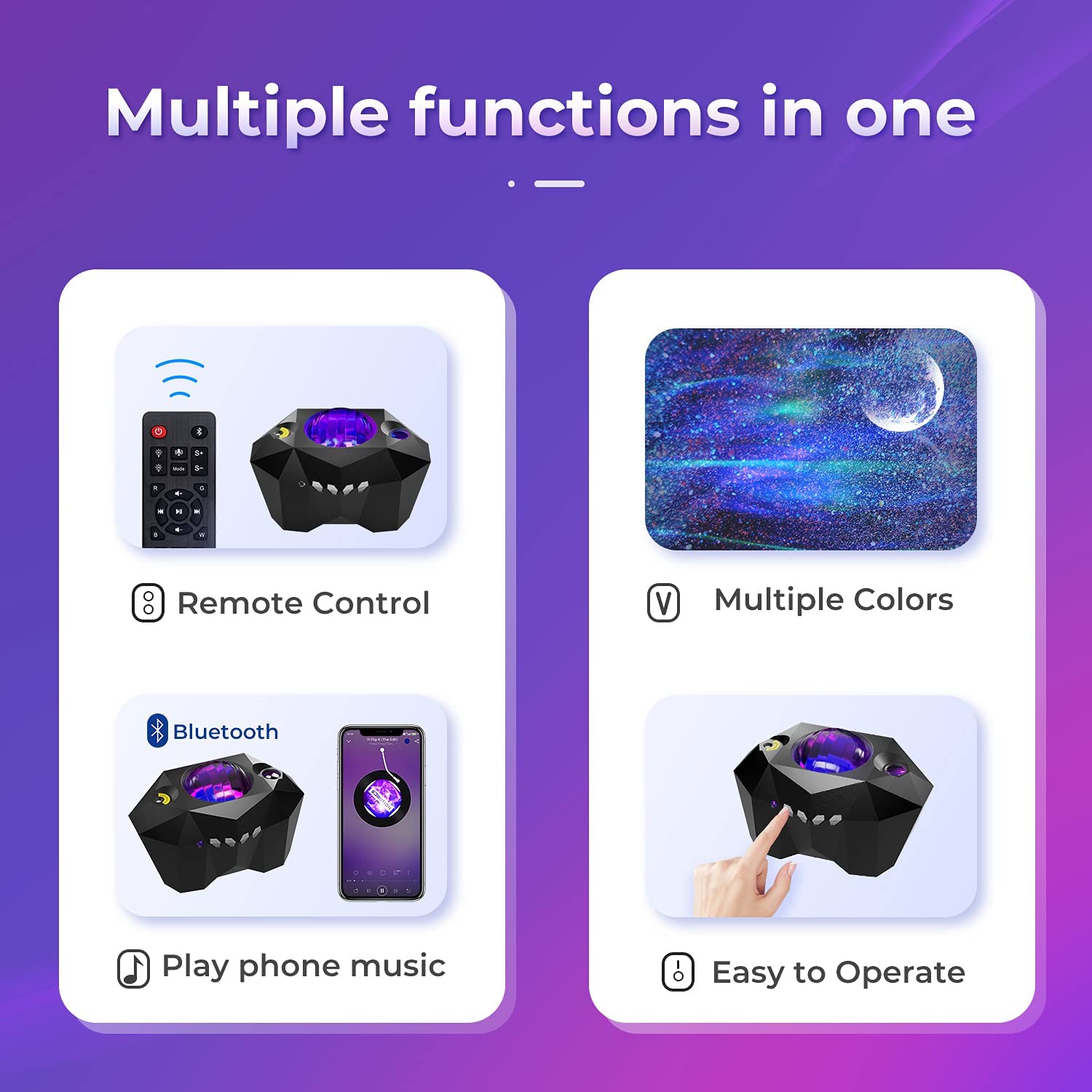 Galaxy Light Projector to create a romantic, gorgeous, and magical atmosphere and to light up your life for you, suitable for Bedroom, Game Rooms, Baby Room, family and your friends, Mothers' Day, Birthday, Christmas Day, Halloween Day, Thanksgiving Day, etc. It creates a wonderful and starry atmosphere, helping children to stimulate curiosity, imagination and creativity.